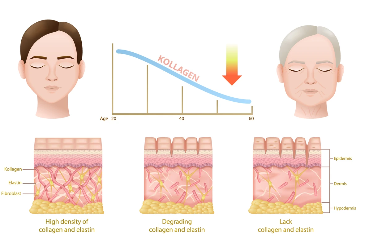 Kolagen membentuk jaringan fibrous yang mengikat sel dan jaringan kulit sehingga kulit tetap kencang dan elastis. Ketika kadar kolagen menurun, kulit menjadi lebih tipis, kurang elastis, dan rentan terhadap kerutan serta garis halus. Selain itu, penurunan kolagen dapat memperlambat proses regenerasi sel kulit, sehingga kulit terlihat kusam dan tidak merata warnanya.