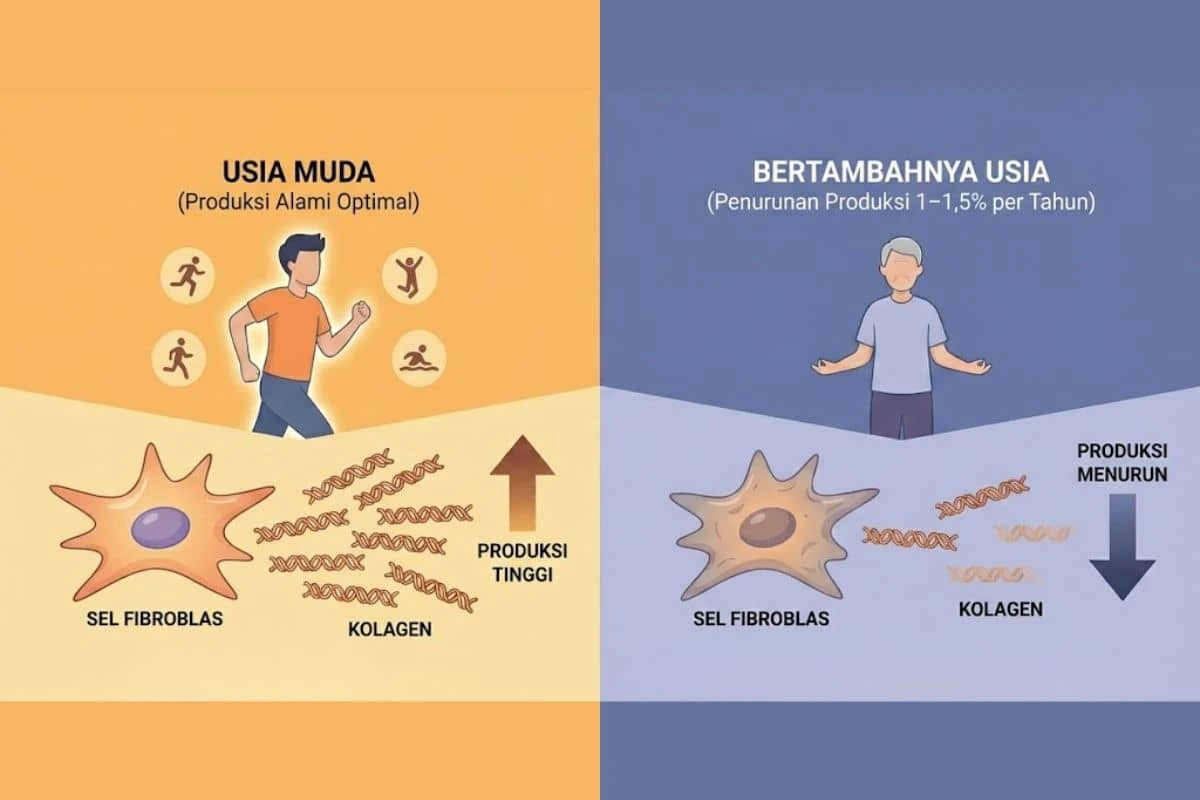 Seiring bertambahnya usia, tubuh secara alami mengalami penurunan produksi kolagen. Studi dermatologi menunjukkan bahwa sejak usia 25 tahun, produksi kolagen menurun sekitar 1% setiap tahun. Penurunan ini menyebabkan jaringan kulit menjadi kurang elastis dan lebih rentan terhadap kerusakan.